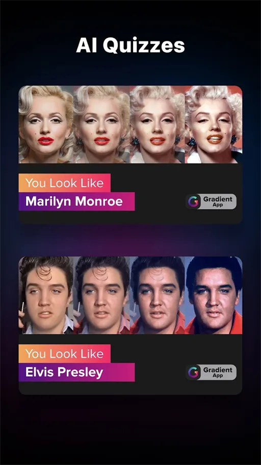 - تشابه المشاهير : يمنح تنزيل برنامج Gradient مهكر للأندرويد ميزة مسلية تتيح اكتشاف أي شخصية مشهورة تشبهك من خلال مقارنة ملامح وجهك بقاعدة بيانات واسعة تضم العديد من المشاهير حول العالم. عند رفع الصورة يقوم التطبيق بتحليل تفاصيل دقيقة مثل شكل الأنف والعينين والفم وعظام الخدود، ثم يعرض قائمة بأقرب الوجوه تطابقاً مع نسبة تشابه مئوية واضحة. بالإضافة إلى ذلك يمكن دمج صورتك مع صور المشاهير لرؤية النتيجة بشكل إبداعي وجذاب. هذه الخاصية تعزز التفاعل وتوفر محتوى ممتعاً يمكن مشاركته مع الأصدقاء على منصات التواصل الاجتماعي بسهولة وبطريقة ملفتة للنظر.