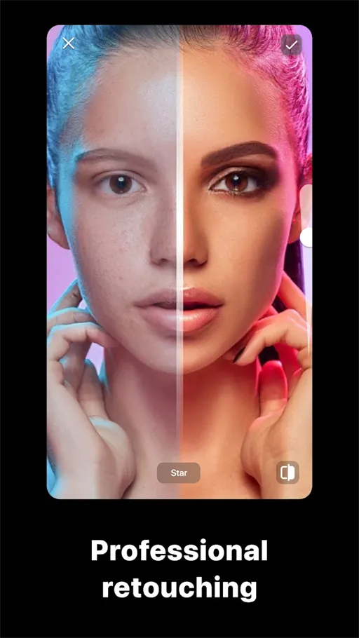 من الميزات القوية التي يقدمها تطبيق Gradient Celebrity Look Like مهكر بدون اعلانات أداة إزالة العيوب الذكية التي تعمل بلمسة واحدة فقط على أي بقعة أو أثر غير مرغوب فيه داخل الصورة. بمجرد الضغط على العيب يقوم التطبيق بإزالته وملء المكان بنسيج مطابق للبشرة المحيطة بطريقة احترافية تحافظ على الواقعية. تتوفر أيضاً أداة تبييض الأسنان التي تجعل الابتسامة أكثر إشراقاً وجاذبية، بالإضافة إلى أداة إزالة الهالات السوداء أسفل العينين لمنح مظهر أكثر نشاطاً وحيوية. يحتفظ التطبيق بسجل كامل لخطوات التحرير لسهولة التراجع عند الحاجة، كما يوفر زر مقارنة يعرض الصورة الأصلية والمعدلة جنباً إلى جنب بوضوح.